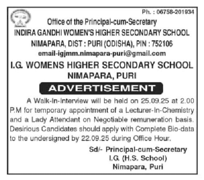 The INDIRA GANDHI WOMEN'S HIGHER SECONDARY SCHOOL, a leading institution of higher education in Humanities at +2 (Pass & Hons.) level and in Science at +2 level, got established in the year 1986, on the south-western fringe of the Nimapara, has been consistently diffusing Women's education and Culture in...